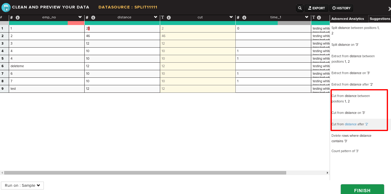 Step 2: On preview screen, select the column in which you want to cut something. As and when you highlight some values within the column, you can get a list of suggested cut operations which is possible on that column in suggestions tab of right panel.
